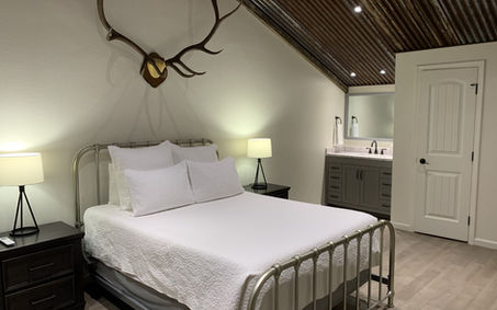 The recently renovated 450 sq. ft. Bunkhouse One is stunningly decorated in muted sand tones offering a warm, inviting space with traditional charm. With contemporary décor and rustic design elements, this cabin offers two luxurious queen beds and a comfortable, inviting leather loveseat sitting area.
